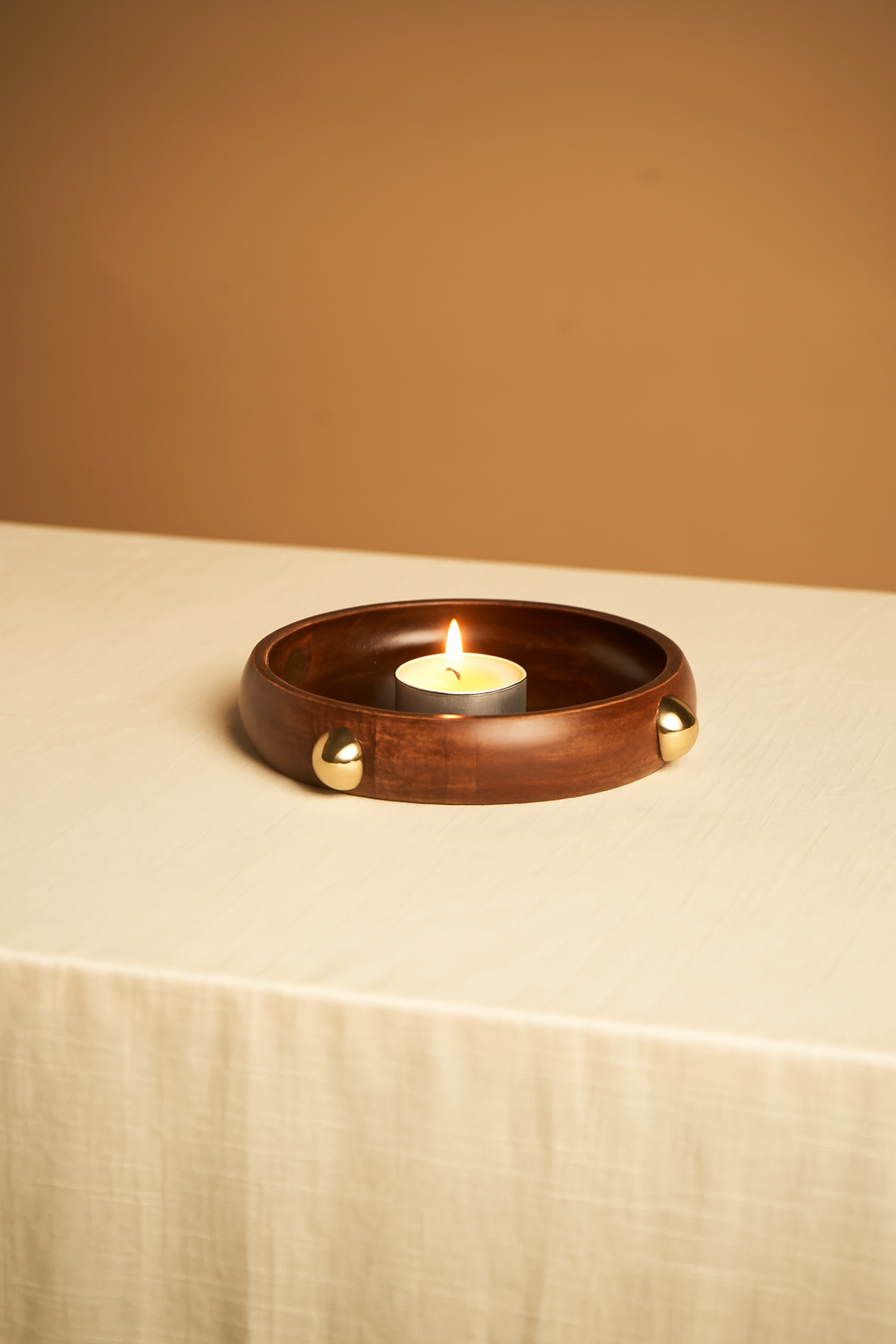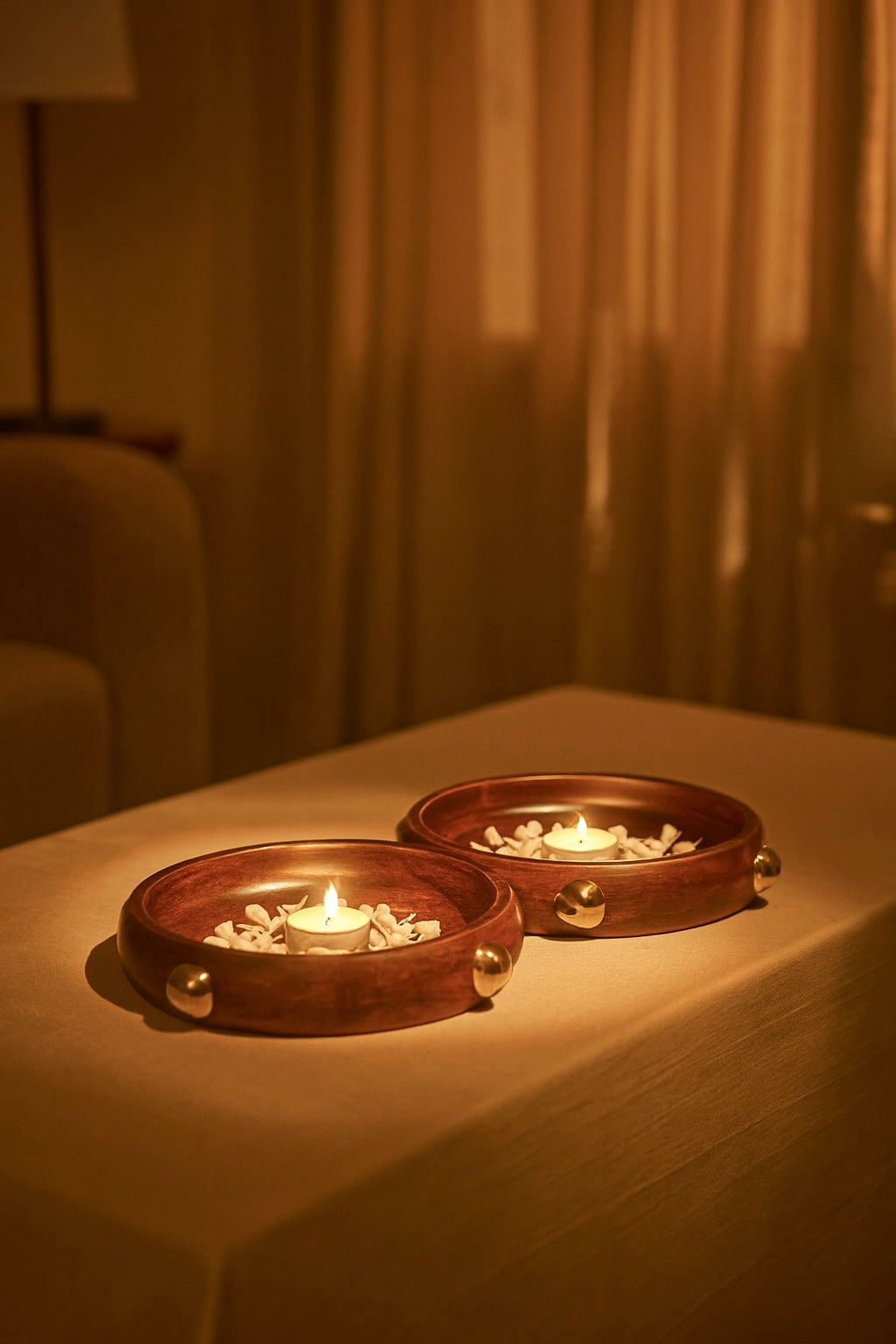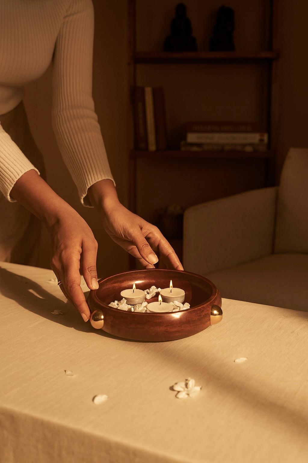 As the festive season approaches, Prakāśa Thālī emerges as a symbol of grace and tradition—crafted not just for utility, but for celebration. Handcarved in wood and embellished with brass studs, this elegant piece serves as both a striking décor accent and a sacred Pooja thali. Its versatile charm makes it perfect for adorning living spaces, illuminating festive rituals, or gifting as a token of warmth and blessings. A timeless blend of heritage and modern refinement, Prakāśa Thālī radiates beauty and devotion, making every occasion glow with meaning.